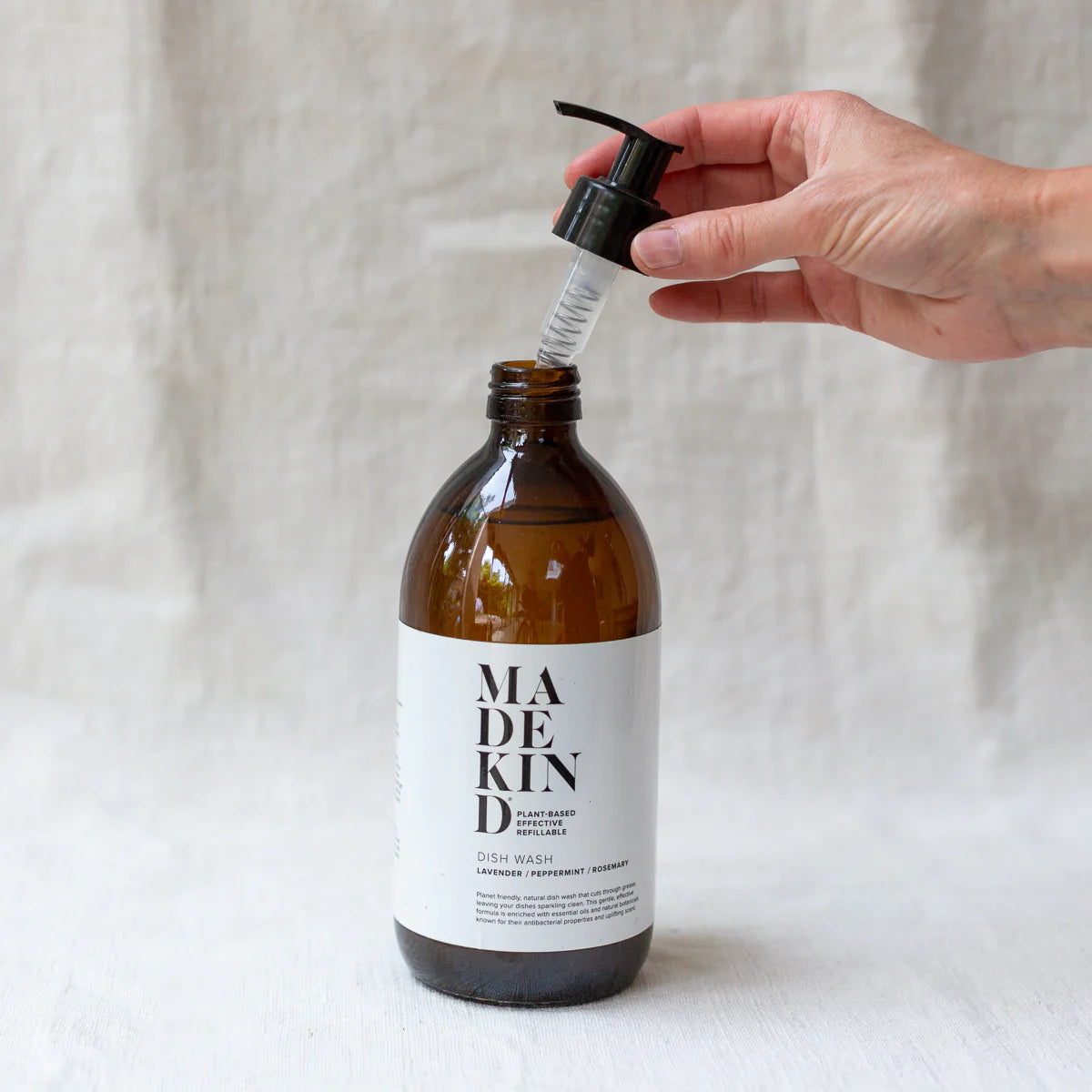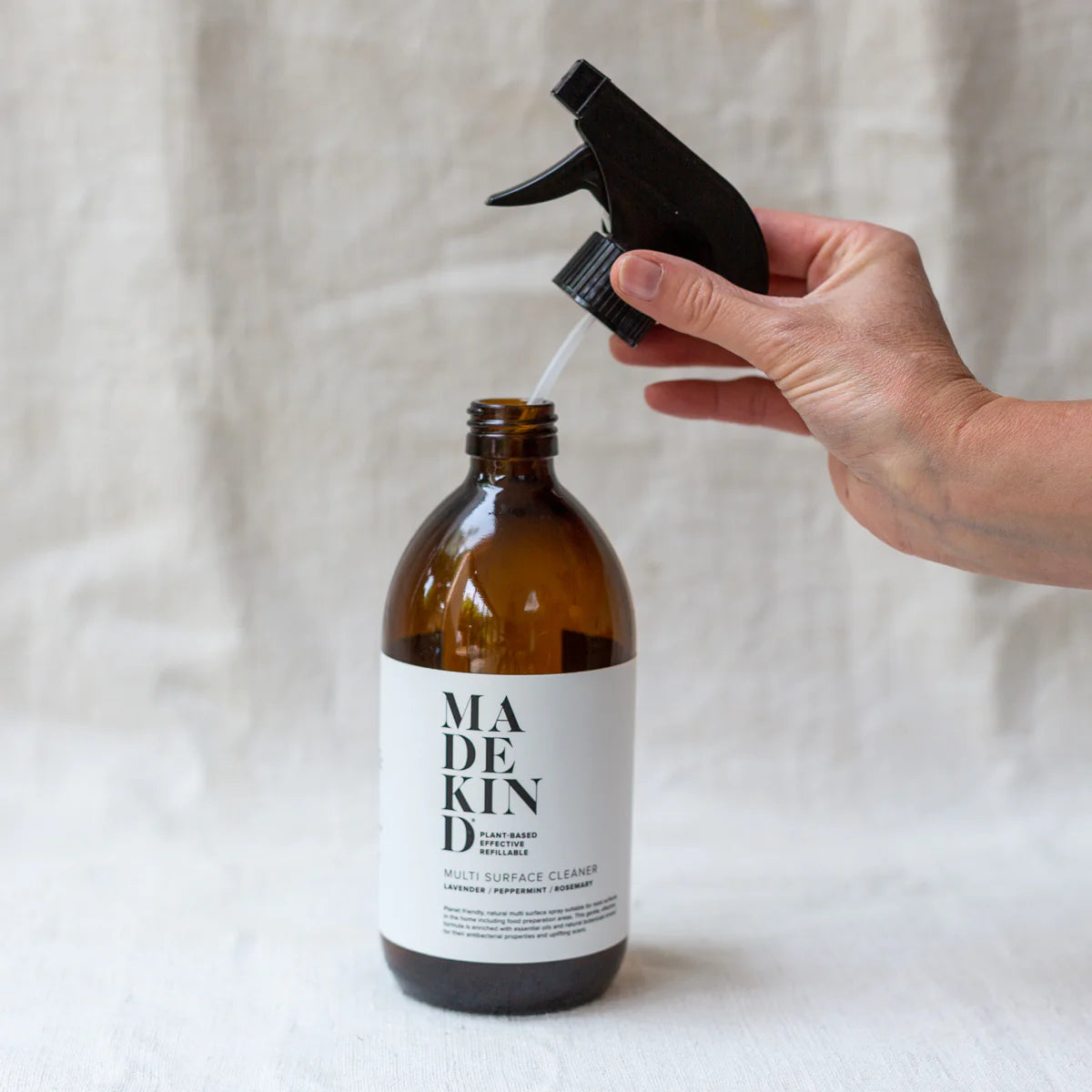 500ml empty glass amber bottle for MadeKind cleaners. This sturdy 'forever bottle' can be filled from a MadeKind 1 litre refill pouch or 3 litre 'bag in box' refill. Select which label you require ; Multi Surface Cleaner, Bathroom Cleaner, Floor Cleaner or Dish Wash. The empty Multi Surface Cleaner and Bathroom Cleaner bottles come with a spray nozzle, the Floor Cleaner bottle has an aluminium cap and the Dish Wash has a pump.