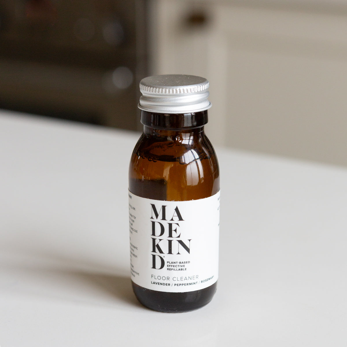 Choice of natural cleaning product in glass bottle; Multi Surface Cleaner, Bathroom Cleaner, Floor Cleaner or Dish Wash. The MadeKind cleaning products are made with non toxic, plant based ingredients that actually work but are kind to your family and the planet. 60ml is the perfect size to trial, take on a camping trip or for a hospital visit.