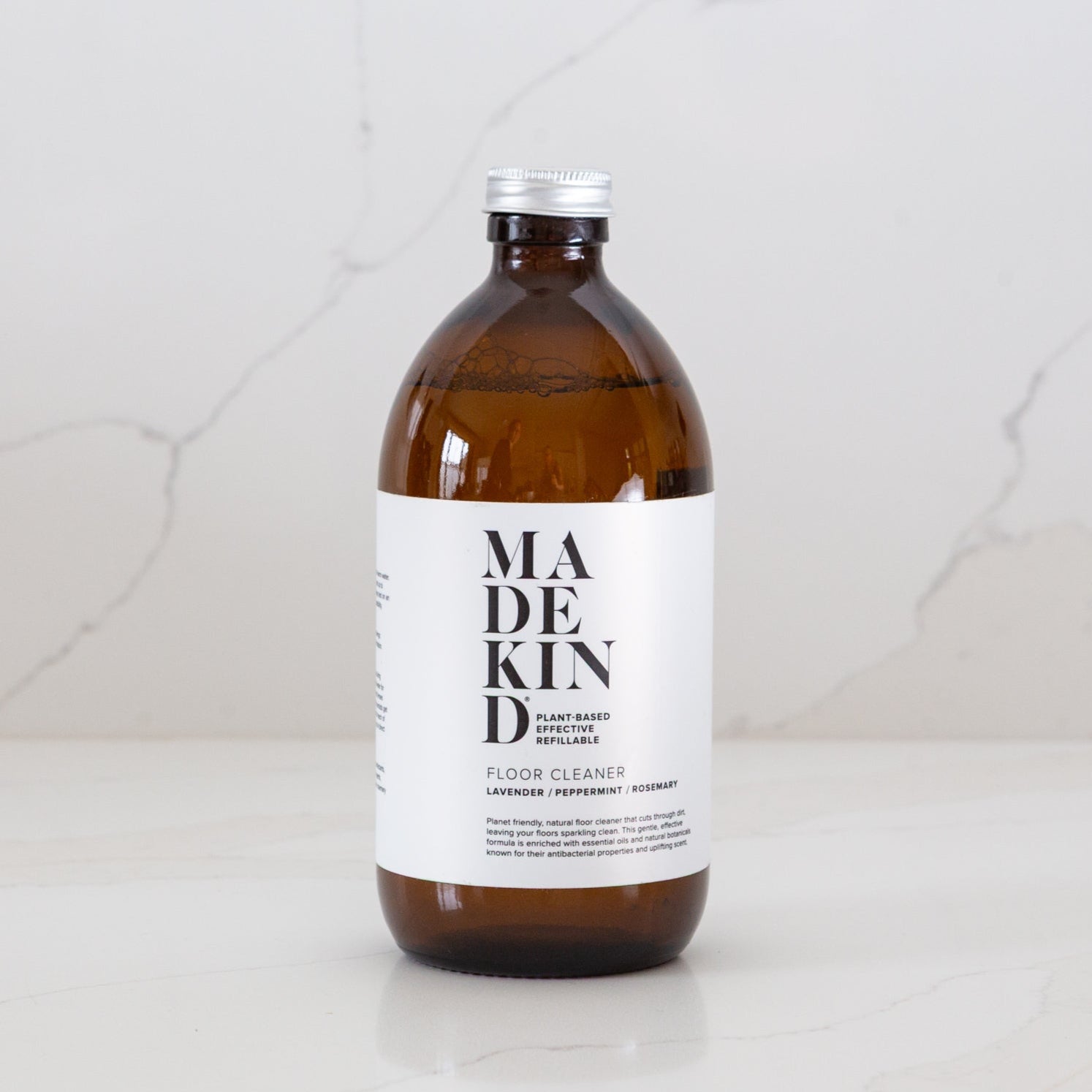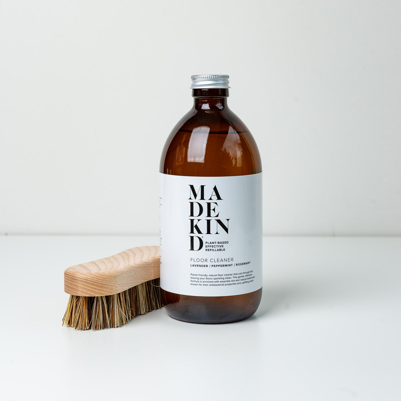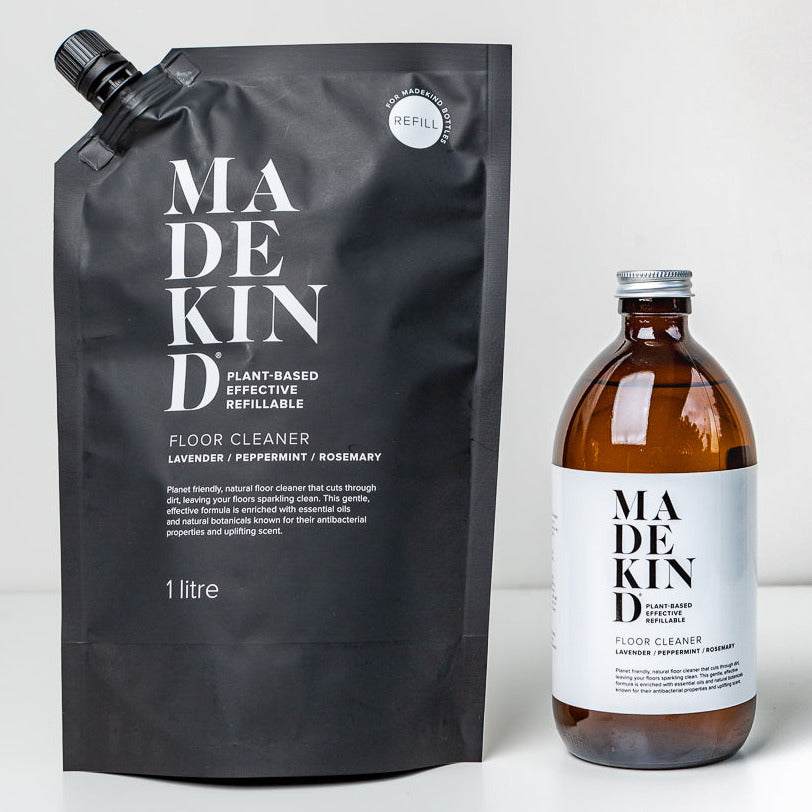 The MadeKind floor cleaner is contained in an amber glass bottle with an aluminium lid, and can be refilled with either a 1 litre pouch or 3 litre bag in box.
